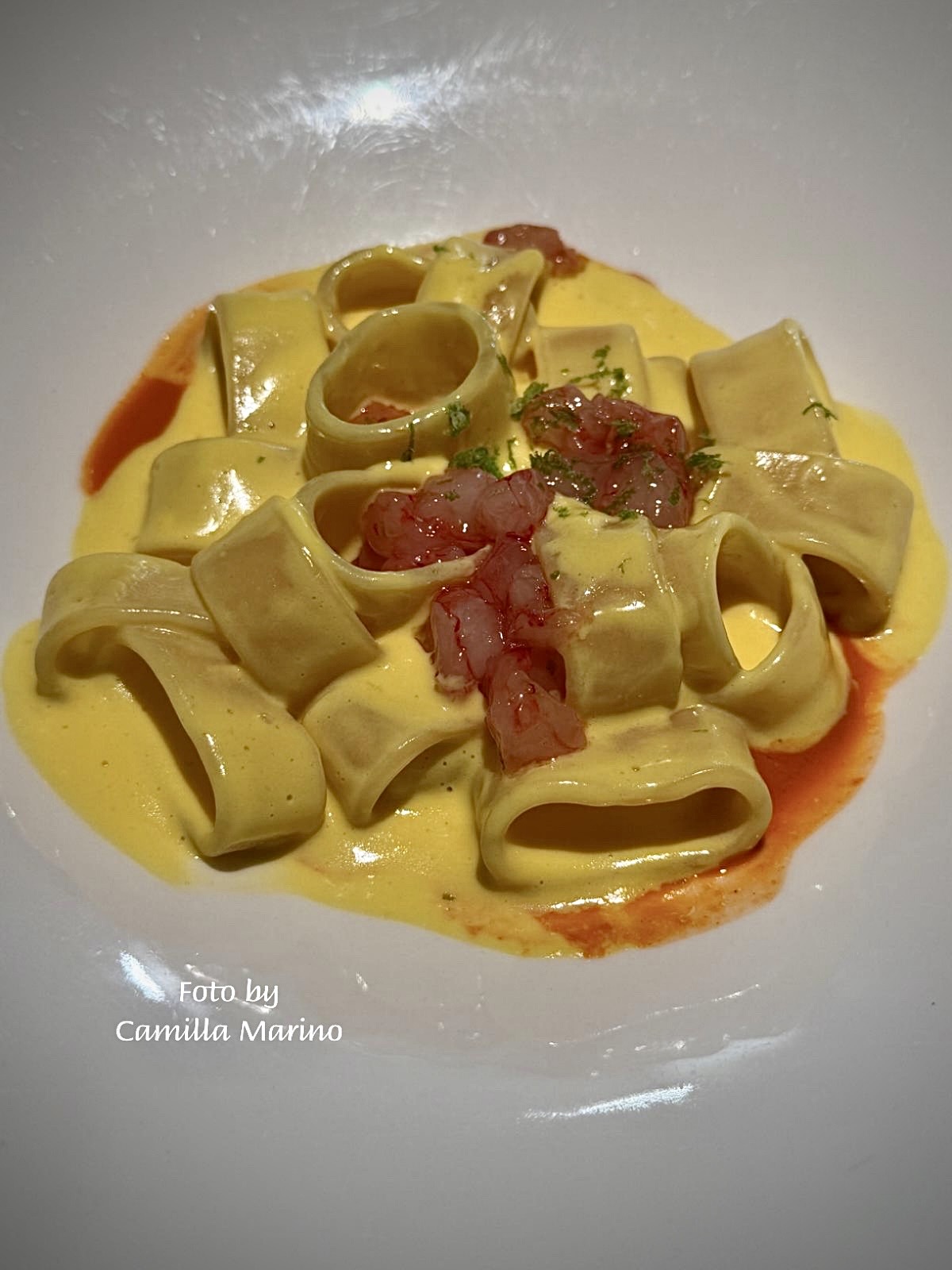 Come nel caso di un primo piatto fisso nel loro menu: la calamarata condita con uno zabaione allo yuzu (un agrume cinese che ricorda un pompelmo verdognolo, ma largamente diffuso anche nella tradizione culinaria giapponese e coreana) e tartare di gambero rosso con la sua bisque, più zafferano.