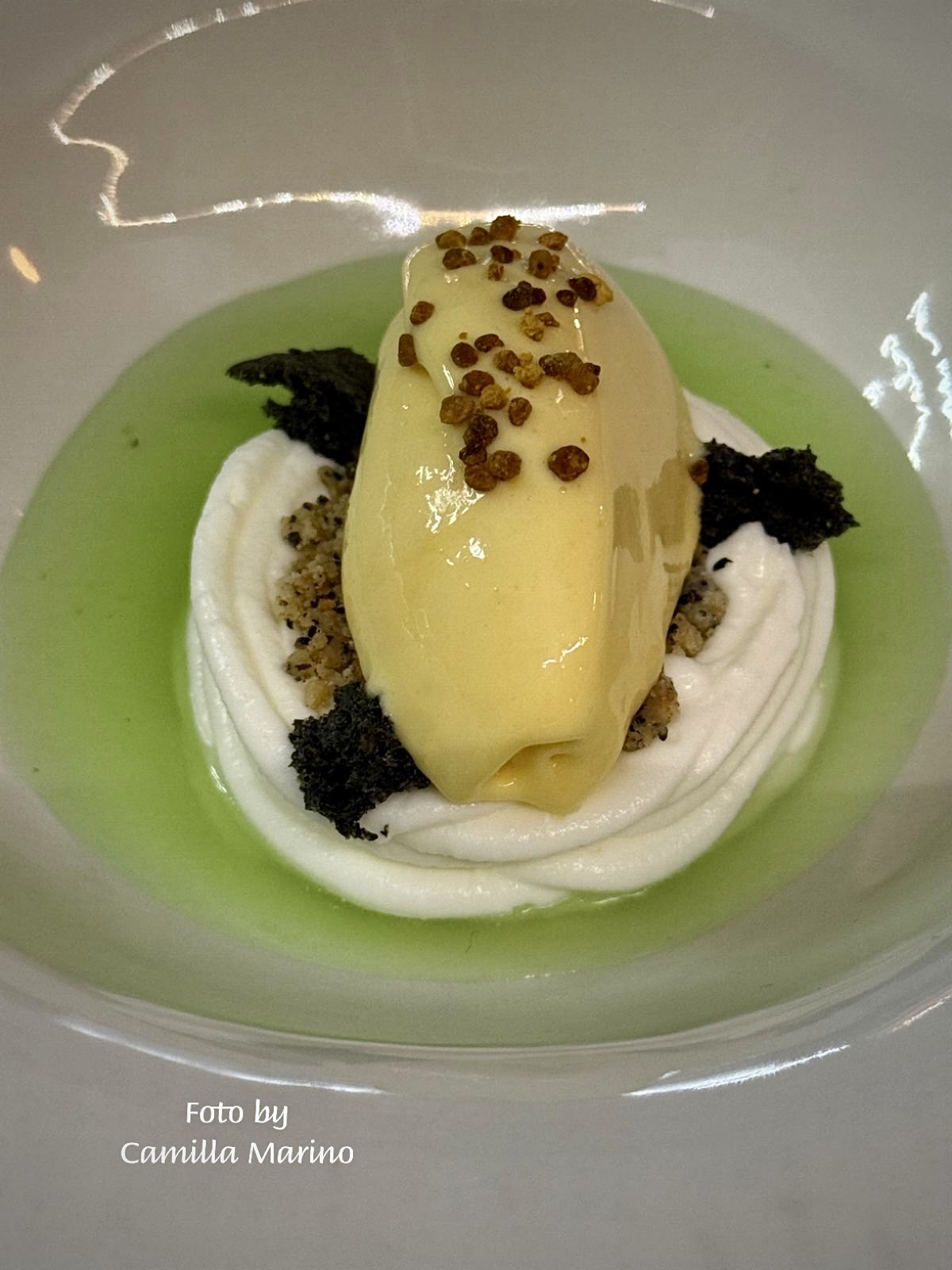 E per concludere la serata in grande stile, ci vuole ovviamente il dessert! Anche in questo caso, Sotto Sale ha osato creando un dolce dagli abbinamenti sorprendenti, chiamato “L’Isola”: mousse di ricotta, crumble di semi misti, gelato al miele di cardo con il suo polline, spugna ai semi di sesamo nero, il tutto circondato da un’acqua aromatizzata con mentuccia fresca, timo e finocchietto selvatico.