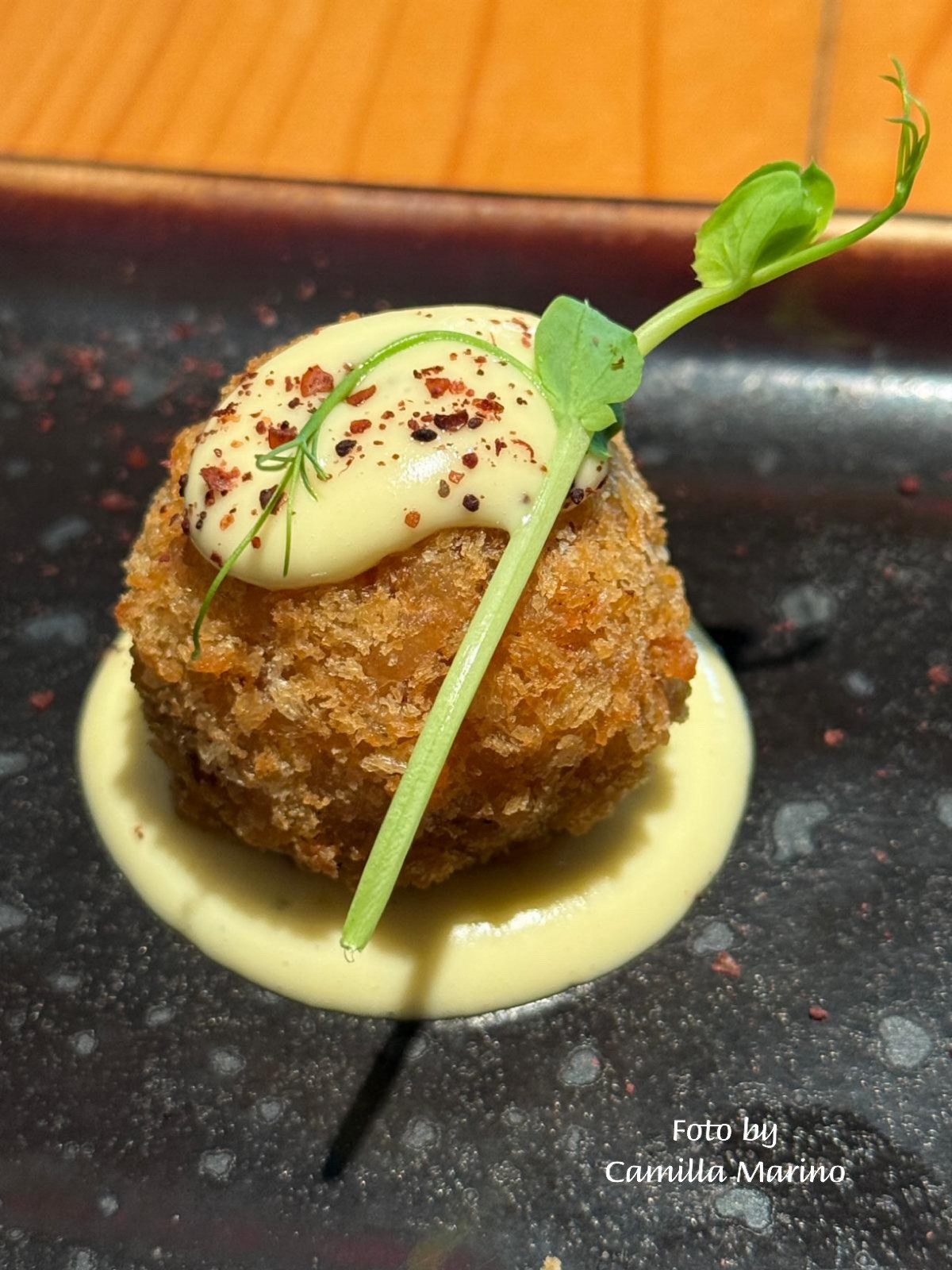 Inoltre, viene servita immediatamente una piccola entrée di benvenuto che cambia a seconda della serata. Per esempio, sono state presentate due mini arancine: una ripiena di polpo con maionese alla paprika e l’altra classica con maionese alla senape.