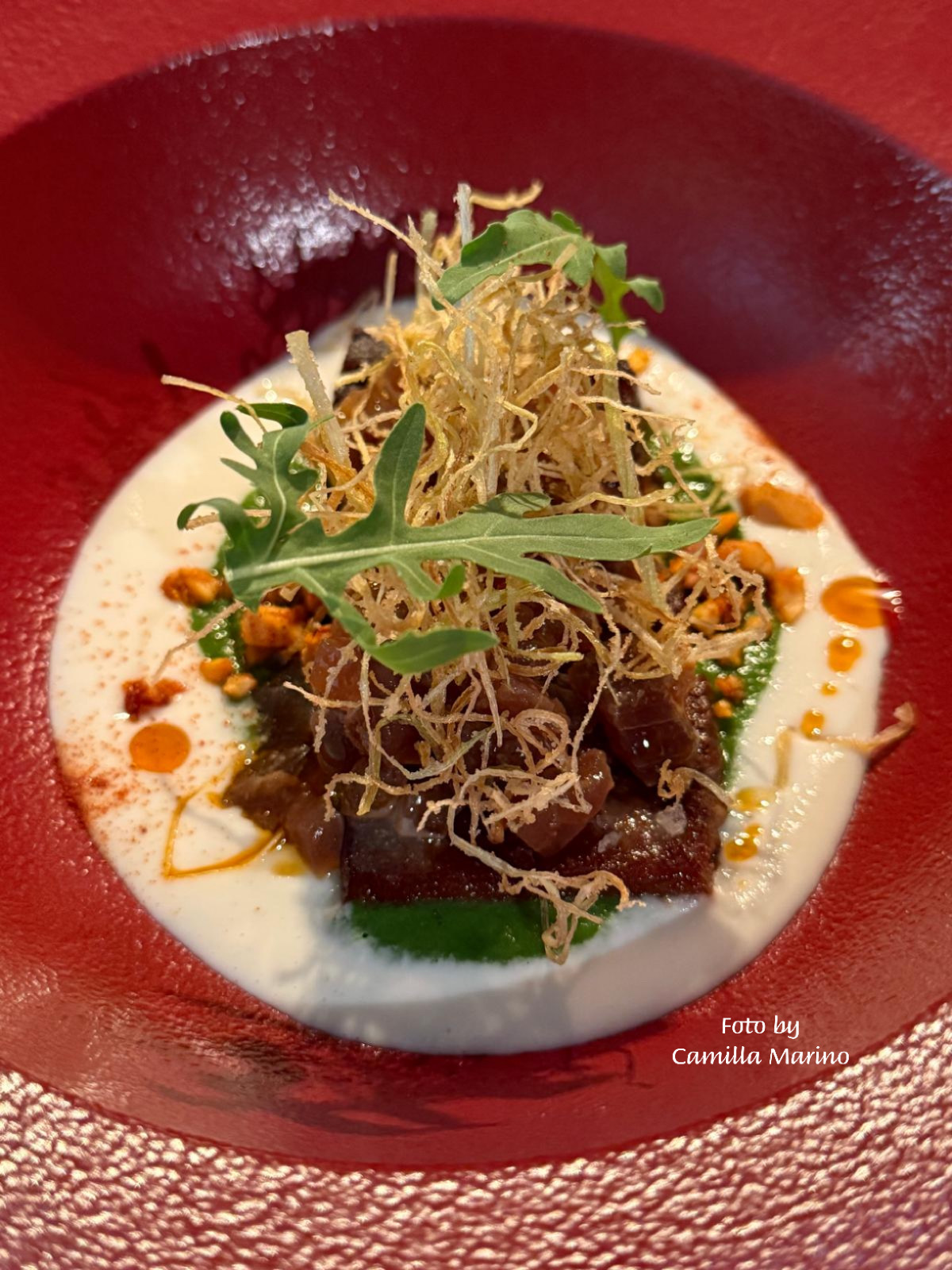 Come in ogni ristorante che si rispetti, naturalmente ci sono i fuori menu. Durante una cena ho avuto modo di assaggiare uno degli antipasti più goduriosi che abbia mai mangiato: una lingua di vitello cotta a bassa temperatura e piastrata, accostata a una tartare di tonno rosso marinata in salsa piccante, adagiate su due creme, una di mandorla e rafano e una di rucola, con l’aggiunta di filangé di porro arrostito e noccioline alla paprika.