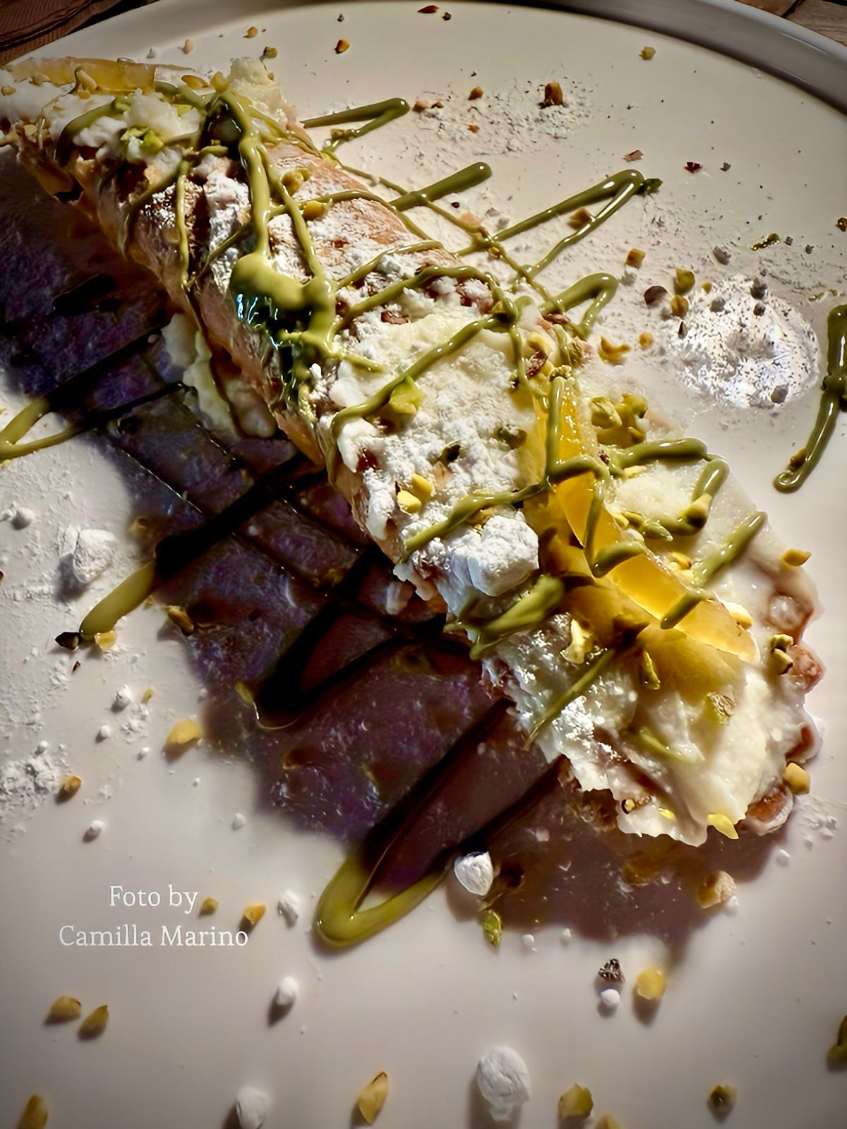 Nonostante la sazietà, non ho potuto fare a meno che commettere un “piccolo” peccato di gola, facendomi servire uno dei dessert (o, come dice la carta, le “cose ruci”, le “cose dolci”): un tradizionale cannolo siciliano, con ricotta di pecora dolce, gocce di cioccolato fondente, scorze d’arancia candita e una spruzzatina di crema di pistacchio. Lungo quanto una baguette (beh, quanto una baguette no, ma le dimensioni sono importanti), è stato una grandiosa coccola di fine pasto.