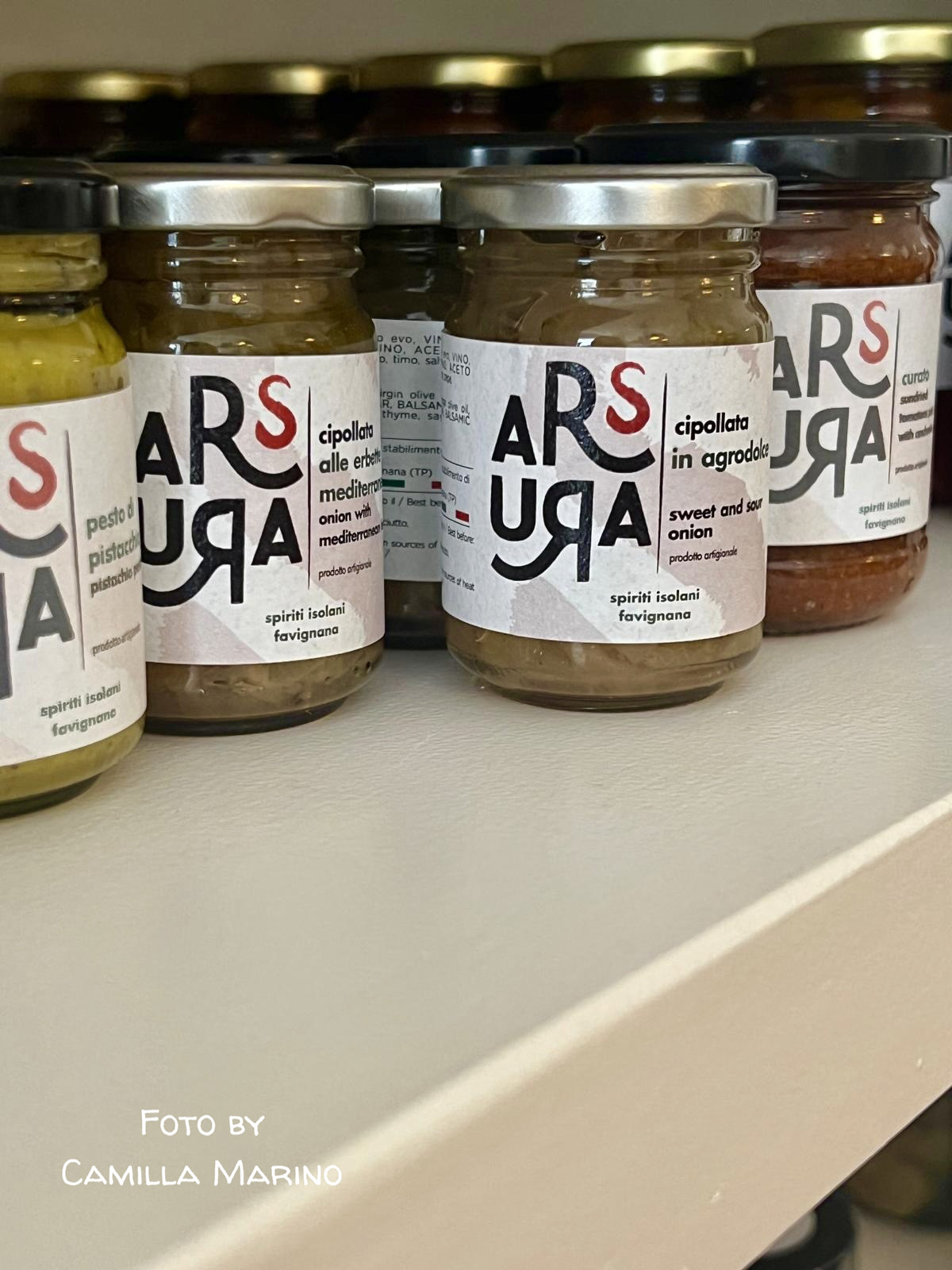 Oppure, da Arsura, potete gustare anche due varietà di paté a base di pomodoro secco: la Sciruccata, molto piccante, il cui nome prende spunto dal caldo e rovente vento di Scirocco, che sta soffiando proprio in questo momento, mentre stiamo piacevolmente chiacchierando e il Curato, il cui nome ricorda il modo in cui veniva chiamato in passato il capo degli scavatori nelle cave di calcarenite, chiamati “cavatori”, e il cui pasto giornaliero era composto principalmente da pomodoro, formaggio, un pezzo di pane e alici sotto sale. Intanto io sono già alla fine del secondo calice.