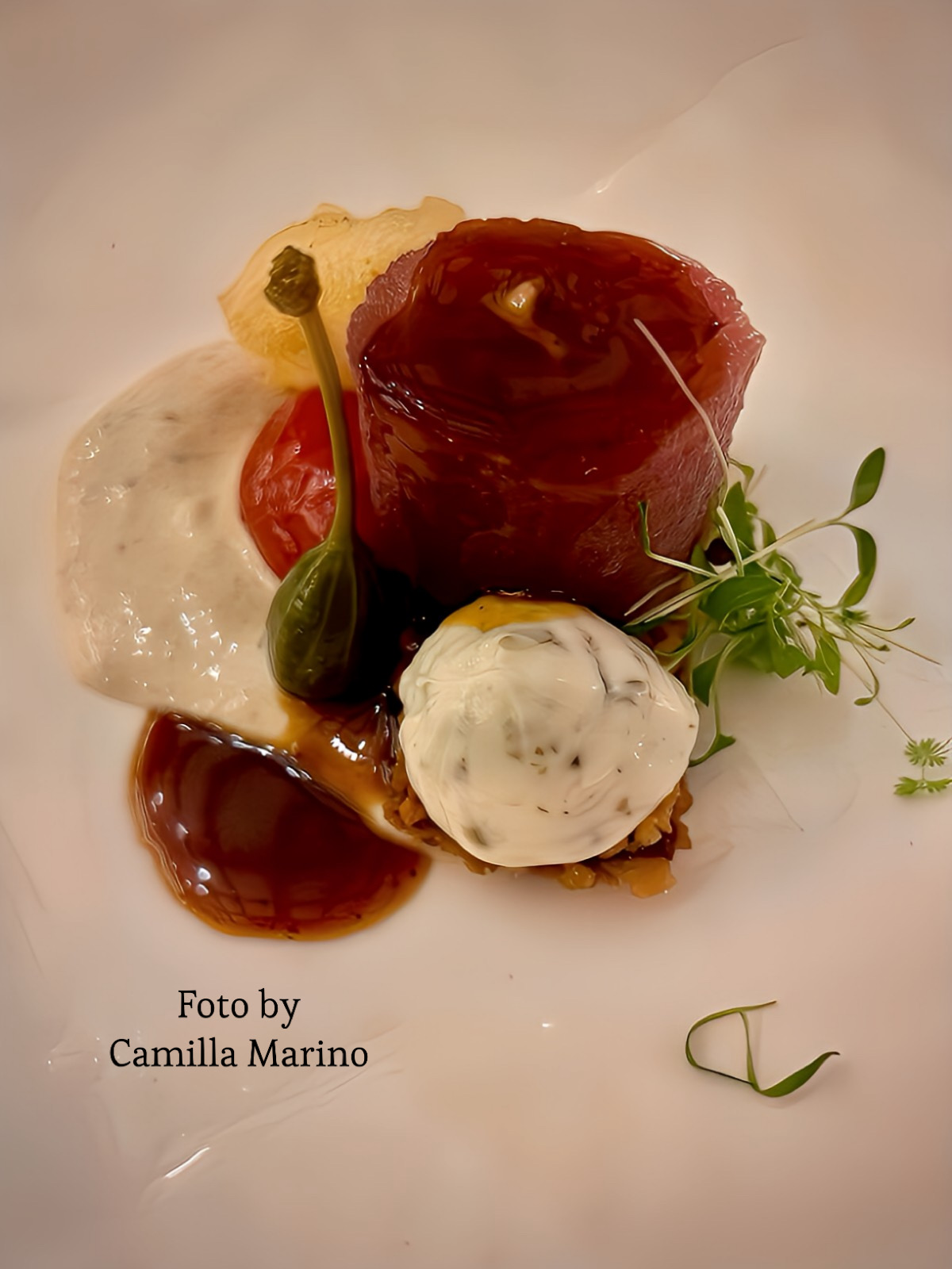 Una pietanza che mi ha piacevolmente sorpresa e che ho trovato molto interessante in fatto di innovazione e inventiva, nel corso della cena, è stata una rivisitazione “scomposta” del classico vitello tonnato (e anche qui, rimbalziamo in settentrione): un rotolo di tonno crudo rosso di Favignana, accostato a una tempura di limone, adagiato su un rettangolo di cotoletta di vitello alla milanese, guarnito con una mousse di maionese al cappero e salsa tonnata, accompagnato da un pomodorino arrostito e terminato al tavolo con un fondo di ossa di manzo.