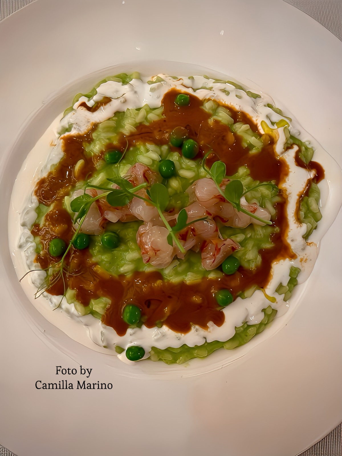 Sono rimasta gradevolmente stupita dal primo dei first course della degustazione: un risotto con crema di piselli, burrata, completato da una tartare di gamberi rossi con la sua bisque. Con quest’ultimo termine, si indica una zuppa o un brodo a base di crostacei, generalmente di gamberi, di aragosta o di astice. È curioso che, in passato, la bisque si riferisse a una zuppa di piccioni e che abbia cambiato il suo significato nel corso del tempo.