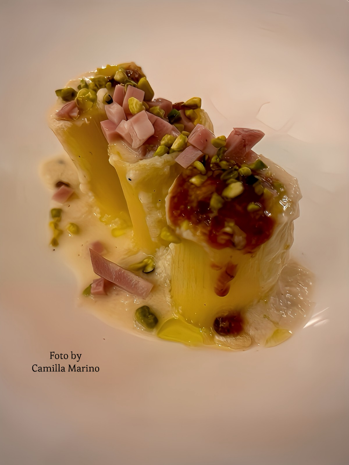 La seconda portata principale ha spostato la mente di noi avventori nel Lazio: mezzi paccheri farciti di cacio e pepe, con ricci di mare, mortadella e granola di pistacchi. Lo so cosa diranno i favignanesi (anche in merito all’amuse-buche): il pesce con il formaggio? Eppure, signori, dovete ricredervi, perché è vero che potrebbe essere visto come un grande azzardo, ma la scoperta nel tempo di alcuni abbinamenti risulta assolutamente golosa e ben studiata. Un piatto veramente godurioso, di quelli che riempiono lo stomaco con poche forchettate e che sono una gioia per la volta palatina.